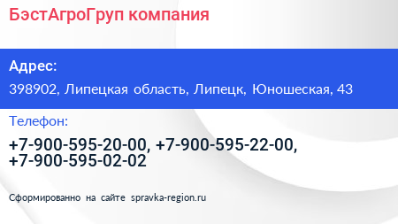 БэстАгроГруп, компания по адресу 398902, Липецкая область, Липецк, Юношеская, 43 в дальнейшем Организация, размещена в следующих категориях:
