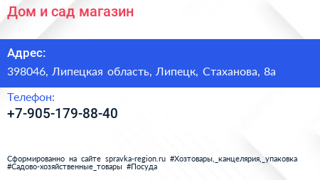 Дом и сад, магазин по адресу 398046, Липецкая область, Липецк, Стаханова, 8а в дальнейшем Организация, размещена в следующих категориях: