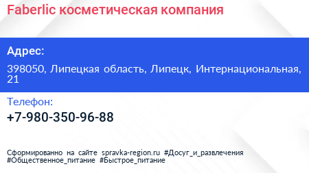 Faberlic, косметическая компания по адресу 398050, Липецкая область, Липецк, Интернациональная, 21 в дальнейшем Организация, размещена в следующих категориях: