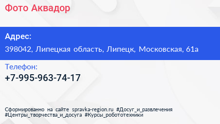 Фото Аквадор по адресу 398042, Липецкая область, Липецк, Московская, 61а в дальнейшем Организация, размещена в следующих категориях: