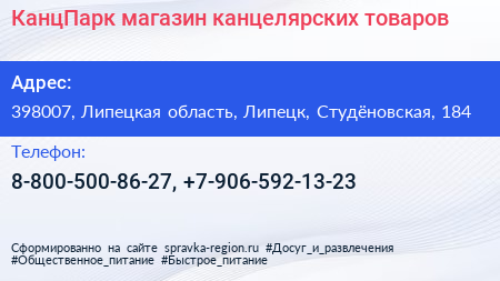 КанцПарк, магазин канцелярских товаров по адресу 398007, Липецкая область, Липецк, Студёновская, 184 в дальнейшем Организация, размещена в следующих категориях: