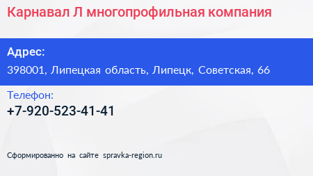 Карнавал-Л, многопрофильная компания по адресу 398001, Липецкая область, Липецк, Советская, 66 в дальнейшем Организация, размещена в следующих категориях: