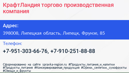 КрафтЛандия, торгово-производственная компания по адресу 398008, Липецкая область, Липецк, Фрунзе, 85 в дальнейшем Организация, размещена в следующих категориях: