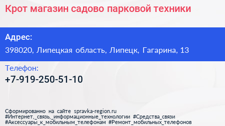 Крот, магазин садово-парковой техники по адресу 398020, Липецкая область, Липецк, Гагарина, 13 в дальнейшем Организация, размещена в следующих категориях: