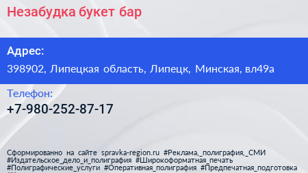 Незабудка, букет-бар по адресу 398902, Липецкая область, Липецк, Минская, вл49а в дальнейшем Организация, размещена в следующих категориях: