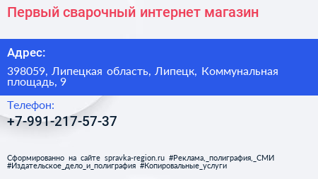 Первый сварочный, интернет-магазин по адресу 398059, Липецкая область, Липецк, Коммунальная площадь, 9 в дальнейшем Организация, размещена в следующих категориях: