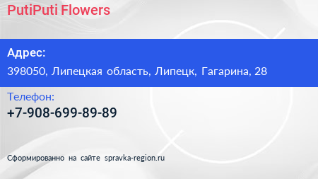PutiPuti Flowers по адресу 398050, Липецкая область, Липецк, Гагарина, 28 в дальнейшем Организация, размещена в следующих категориях: