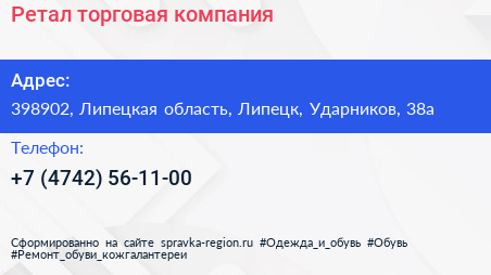 Ретал, торговая компания по адресу 398902, Липецкая область, Липецк, Ударников, 38а в дальнейшем Организация, размещена в следующих категориях: