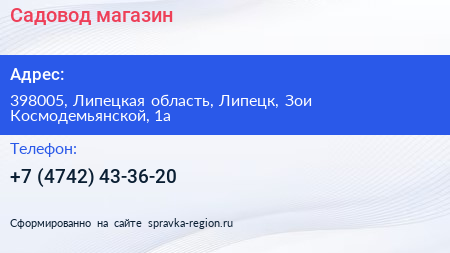 Садовод, магазин по адресу 398005, Липецкая область, Липецк, Зои Космодемьянской, 1а в дальнейшем Организация, размещена в следующих категориях: