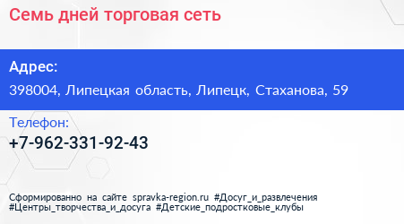 Семь дней, торговая сеть по адресу 398004, Липецкая область, Липецк, Стаханова, 59 в дальнейшем Организация, размещена в следующих категориях: