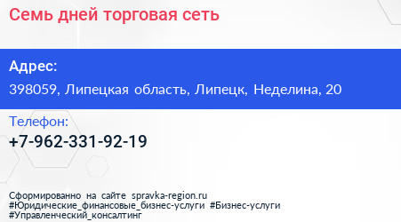 Семь дней, торговая сеть по адресу 398059, Липецкая область, Липецк, Неделина, 20 в дальнейшем Организация, размещена в следующих категориях: