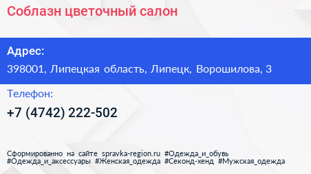 Соблазн, цветочный салон по адресу 398001, Липецкая область, Липецк, Ворошилова, 3 в дальнейшем Организация, размещена в следующих категориях: