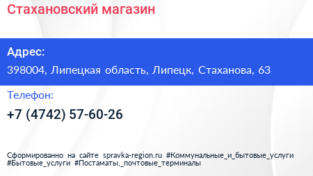 Стахановский, магазин по адресу 398004, Липецкая область, Липецк, Стаханова, 63 в дальнейшем Организация, размещена в следующих категориях: