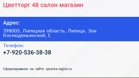 Цветторг-48, салон-магазин по адресу 398005, Липецкая область, Липецк, Зои Космодемьянской, 1 в дальнейшем Организация, размещена в следующих категориях: