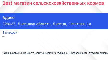 Best, магазин сельскохозяйственных кормов по адресу 398037, Липецкая область, Липецк, Опытная, 1д в дальнейшем Организация, размещена в следующих категориях: