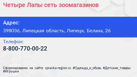 Четыре Лапы, сеть зоомагазинов по адресу 398036, Липецкая область, Липецк, Белана, 26 в дальнейшем Организация, размещена в следующих категориях: