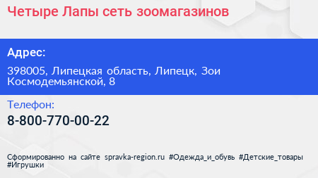 Четыре Лапы, сеть зоомагазинов по адресу 398005, Липецкая область, Липецк, Зои Космодемьянской, 8 в дальнейшем Организация, размещена в следующих категориях: