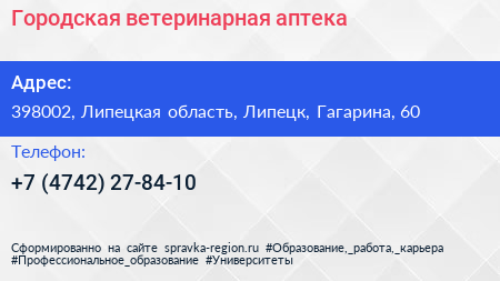 Городская ветеринарная аптека по адресу 398002, Липецкая область, Липецк, Гагарина, 60 в дальнейшем Организация, размещена в следующих категориях: