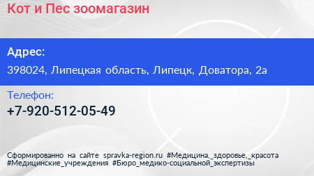 Кот и Пес, зоомагазин по адресу 398024, Липецкая область, Липецк, Доватора, 2а в дальнейшем Организация, размещена в следующих категориях: