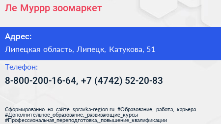 Ле`Муррр, зоомаркет по адресу Липецкая область, Липецк, Катукова, 51 в дальнейшем Организация, размещена в следующих категориях: