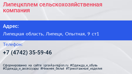 Липецкплем, сельскохозяйственная компания по адресу Липецкая область, Липецк, Опытная, 9 ст1 в дальнейшем Организация, размещена в следующих категориях: