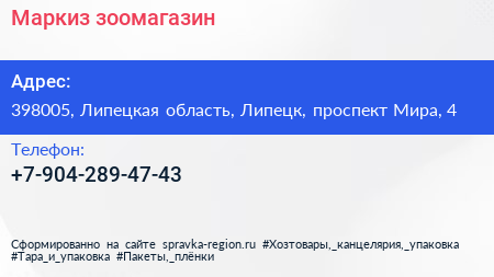 Маркиз, зоомагазин по адресу 398005, Липецкая область, Липецк, проспект Мира, 4 в дальнейшем Организация, размещена в следующих категориях: