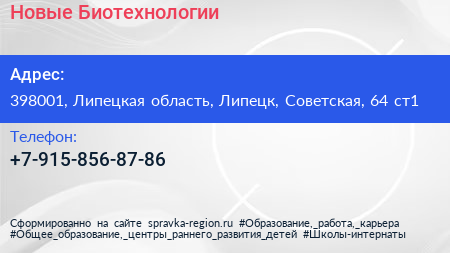 Новые Биотехнологии по адресу 398001, Липецкая область, Липецк, Советская, 64 ст1 в дальнейшем Организация, размещена в следующих категориях:
