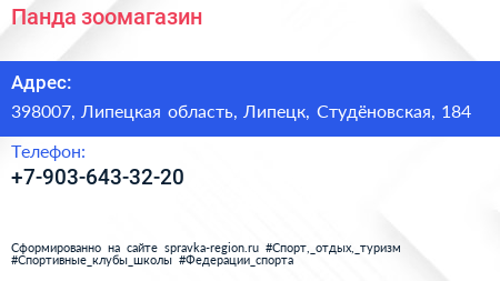 Панда, зоомагазин по адресу 398007, Липецкая область, Липецк, Студёновская, 184 в дальнейшем Организация, размещена в следующих категориях: