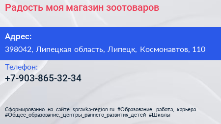 Радость моя, магазин зоотоваров по адресу 398042, Липецкая область, Липецк, Космонавтов, 110 в дальнейшем Организация, размещена в следующих категориях: