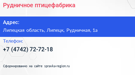 Рудничное, птицефабрика по адресу Липецкая область, Липецк, Рудничная, 1а в дальнейшем Организация, размещена в следующих категориях: