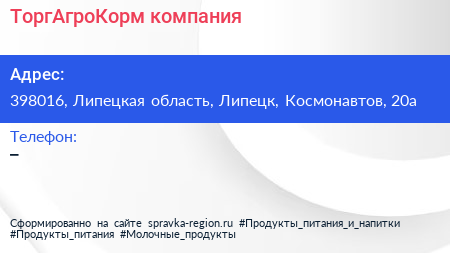 ТоргАгроКорм, компания по адресу 398016, Липецкая область, Липецк, Космонавтов, 20а в дальнейшем Организация, размещена в следующих категориях: