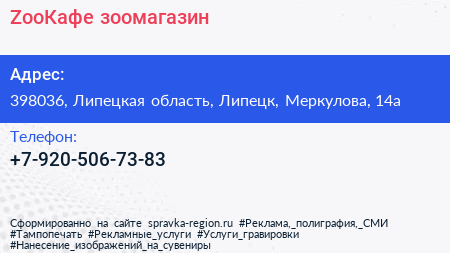 ZooКафе, зоомагазин по адресу 398036, Липецкая область, Липецк, Меркулова, 14а в дальнейшем Организация, размещена в следующих категориях:
