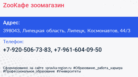 ZooКафе, зоомагазин по адресу 398043, Липецкая область, Липецк, Космонавтов, 44/3 в дальнейшем Организация, размещена в следующих категориях: