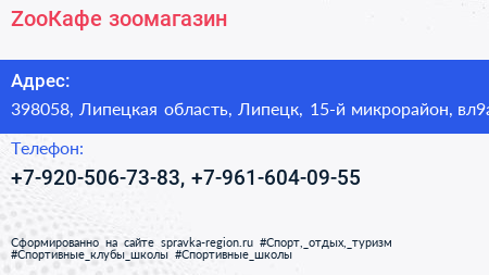 ZooКафе, зоомагазин по адресу 398058, Липецкая область, Липецк, 15-й микрорайон, вл9а в дальнейшем Организация, размещена в следующих категориях: