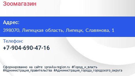 Зоомагазин по адресу 398070, Липецкая область, Липецк, Славянова, 1 в дальнейшем Организация, размещена в следующих категориях: