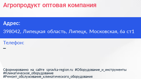 Агропродукт, оптовая компания по адресу 398042, Липецкая область, Липецк, Московская, 6а ст1 в дальнейшем Организация, размещена в следующих категориях: