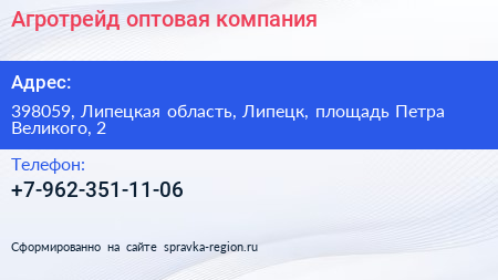 Агротрейд, оптовая компания по адресу 398059, Липецкая область, Липецк, площадь Петра Великого, 2 в дальнейшем Организация, размещена в следующих категориях: