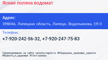 Ясная поляна, водомат по адресу 398046, Липецкая область, Липецк, Водопьянова, 19/3 в дальнейшем Организация, размещена в следующих категориях: