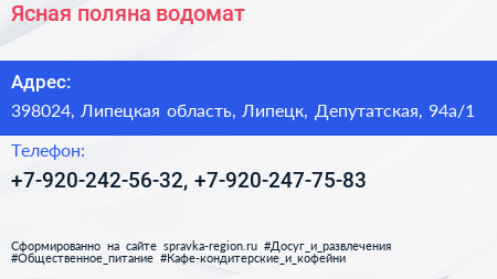 Ясная поляна, водомат по адресу 398024, Липецкая область, Липецк, Депутатская, 94а/1 в дальнейшем Организация, размещена в следующих категориях:
