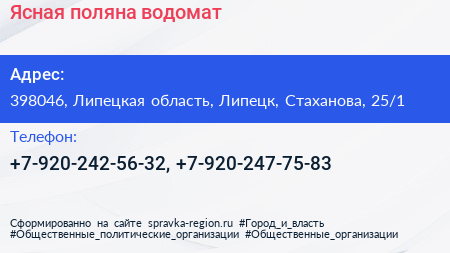 Ясная поляна, водомат по адресу 398046, Липецкая область, Липецк, Стаханова, 25/1 в дальнейшем Организация, размещена в следующих категориях: