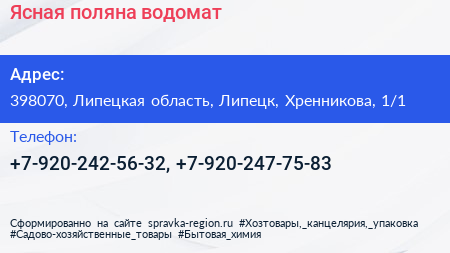 Ясная поляна, водомат по адресу 398070, Липецкая область, Липецк, Хренникова, 1/1 в дальнейшем Организация, размещена в следующих категориях: