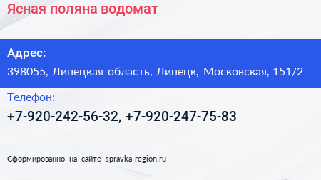 Ясная поляна, водомат по адресу 398055, Липецкая область, Липецк, Московская, 151/2 в дальнейшем Организация, размещена в следующих категориях: