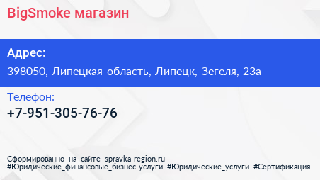 BigSmoke, магазин по адресу 398050, Липецкая область, Липецк, Зегеля, 23а в дальнейшем Организация, размещена в следующих категориях: