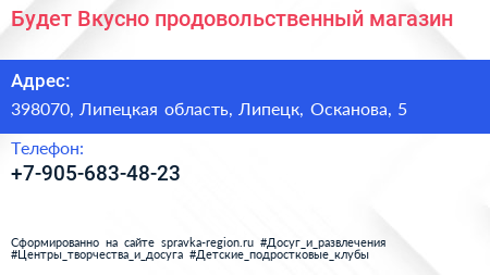Будет Вкусно, продовольственный магазин по адресу 398070, Липецкая область, Липецк, Осканова, 5 в дальнейшем Организация, размещена в следующих категориях: