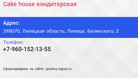Cake house, кондитерская по адресу 398070, Липецкая область, Липецк, Белянского, 2 в дальнейшем Организация, размещена в следующих категориях: