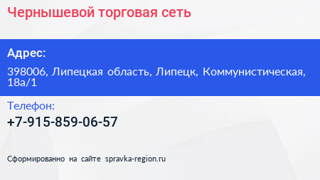 Чернышевой, торговая сеть по адресу 398006, Липецкая область, Липецк, Коммунистическая, 18а/1 в дальнейшем Организация, размещена в следующих категориях: