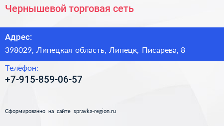 Чернышевой, торговая сеть по адресу 398029, Липецкая область, Липецк, Писарева, 8 в дальнейшем Организация, размещена в следующих категориях:
