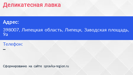 Деликатесная лавка по адресу 398007, Липецкая область, Липецк, Заводская площадь, 9а в дальнейшем Организация, размещена в следующих категориях: