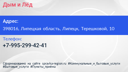 Дым и Лёд по адресу 398016, Липецкая область, Липецк, Терешковой, 10 в дальнейшем Организация, размещена в следующих категориях: