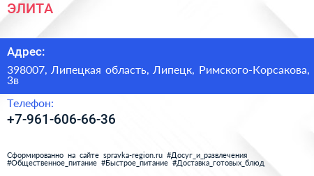 ЭЛИТА по адресу 398007, Липецкая область, Липецк, Римского-Корсакова, 3в в дальнейшем Организация, размещена в следующих категориях: